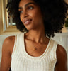 Woman wearing a 14k yellow gold Adelaide paperclip chain necklace featuring one link encrusted with 1.5 mm pavé citrines