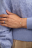 A close-up of a woman’s wrist highlights the Paw & Petite Birthstone Bracelet with a white gemstone and 1/4