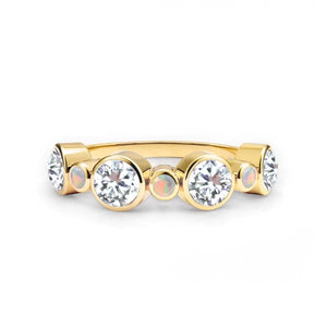 Features four 4mm round cut, bezel set, sustainably grown Diamonds and five 2mm round cut, bezel set, sustainably grown Opals.