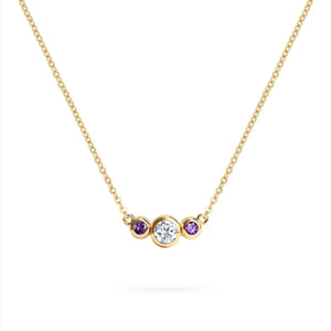 A timeless silhouette, reimagined for the everyday. The Barrington 3 Stone Necklace features a captivating trio of bezel-set stones, one large center Diamond framed by two small Amethysts, symbolizing connection, balance, and the people who matter most. Set on our solid 14k gold saffron chain, this necklace brings a soft shimmer and meaningful elegance to your everyday look. Personalize it with birthstones that represent your children, your journey, or your chosen family, each stone telling a part of your story. Effortlessly wearable and rich with sentiment, this piece layers beautifully with other necklaces like the Adelaide Mini Chain, and The Bayberry 11 Necklace or stands strong on its own as a signature necklace you’ll never want to take off.