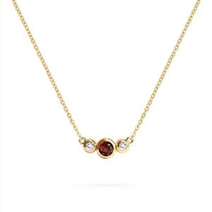 A timeless silhouette, reimagined for the everyday. The Barrington 3 Stone Necklace features a captivating trio of bezel-set stones, one large center Garnet framed by two small Diamonds, symbolizing connection, balance, and the people who matter most. Set on our solid 14k gold saffron chain, this necklace brings a soft shimmer and meaningful elegance to your everyday look. Personalize it with birthstones that represent your children, your journey, or your chosen family, each stone telling a part of your story. Effortlessly wearable and rich with sentiment, this piece layers beautifully with other necklaces like the Adelaide Mini Chain, and The Bayberry 11 Necklace or stands strong on its own as a signature necklace you’ll never want to take off.