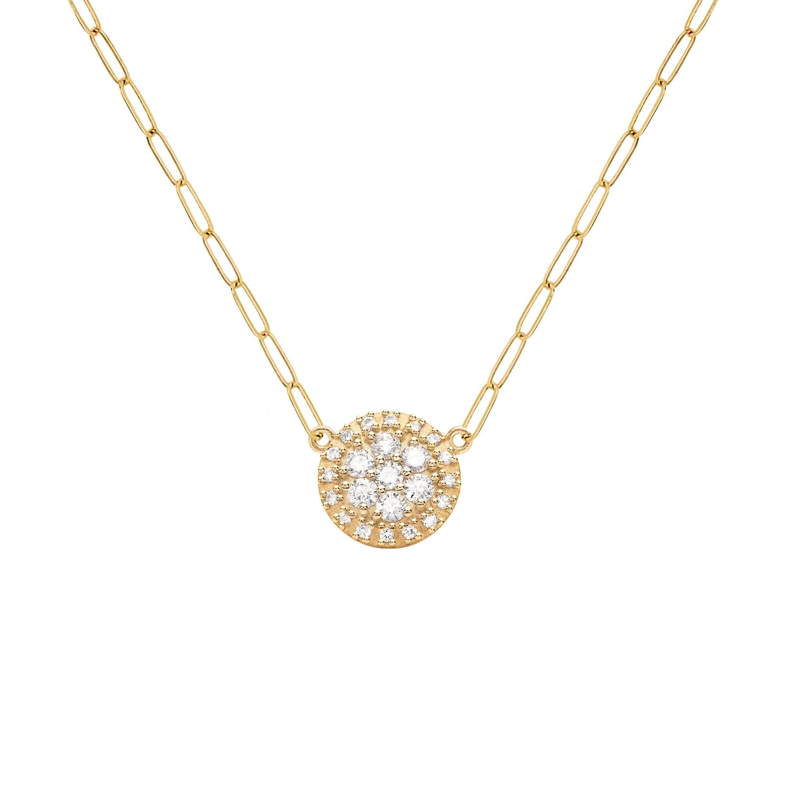 The Palmer Diamond Necklace is a striking, yet subtle, centerpiece that adds a touch of elegance to your everyday style. Its radiant gold disc, intricately encrusted with created Diamonds, blends sophistication and brilliance. Wear it and bring the beauty of sunlight dancing across water with you everywhere you go. Choose between our Classic Cable Chain or sleek Adelaide Mini Chain.
