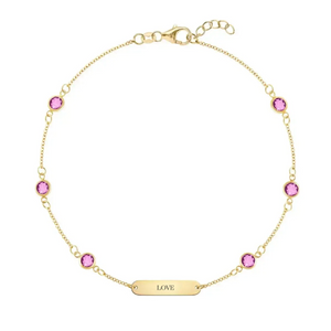A subtle tribute to resilience and hope, this ultra-slim 14k gold bracelet features a plate engraved with the word "LOVE", accompanied by the brilliance of 6 petite bezel set Pink Sapphire. The engraving is intentionally delicate, visible only up close, creating a truly personal piece you can wear every day. In honor of breast cancer awareness, 10% of every purchase from our Pink Awareness Jewelry will be donated to Bright Pink, an organization supporting breast cancer awareness and prevention. Wear yours as a daily reminder, or gift one to someone whose courage inspires you.