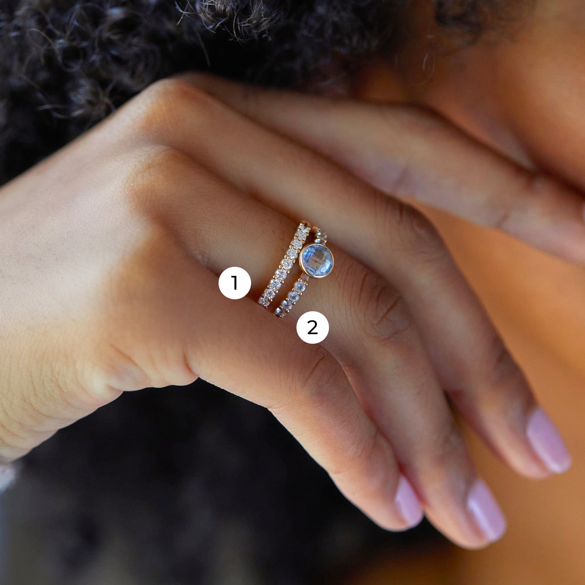A timeless birthstone keepsake for any March baby. As beautiful as it is lightweight, this ring features a round, briolette-cut, bezel-set Grand Aquamarine, flanked on each side by four round-cut, prong-set accent stones: your choice of Aquamarines, Diamonds, or alternating Diamonds and Aquamarines. Slim and comfortable, it stacks wonderfully with other rings, including Rosecliff Stackable rings. An unforgettable birthday gift.