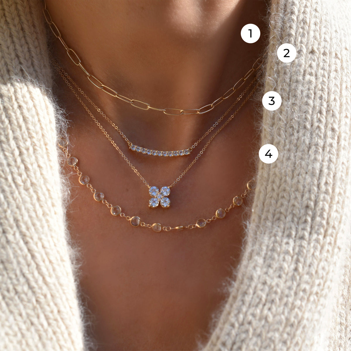 Celebrate April birthdays with an elegant bar necklace with a gentle curve set with eleven 2 mm crystalline White Topaz gemstones prong set in solid 14k gold. Lightweight and sparkly, create a matching set by pairing with Rosecliff Earrings and a Rosecliff Ring for an unforgettable anniversary or birthday gift.
