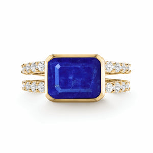 A gorgeous emerald-cut Lapis, hand-set horizontally in a 14k-gold bezel, is accented with 16 prong-set diamonds. A statement piece on its own, and perfect for stacking with other rings. The split-shank band offers a substantial yet lightweight setting. Quite flattering on wider fingers. Classic styling makes this a perfect gift for milestone occasions such as September birthdays, graduations, and anniversaries.
