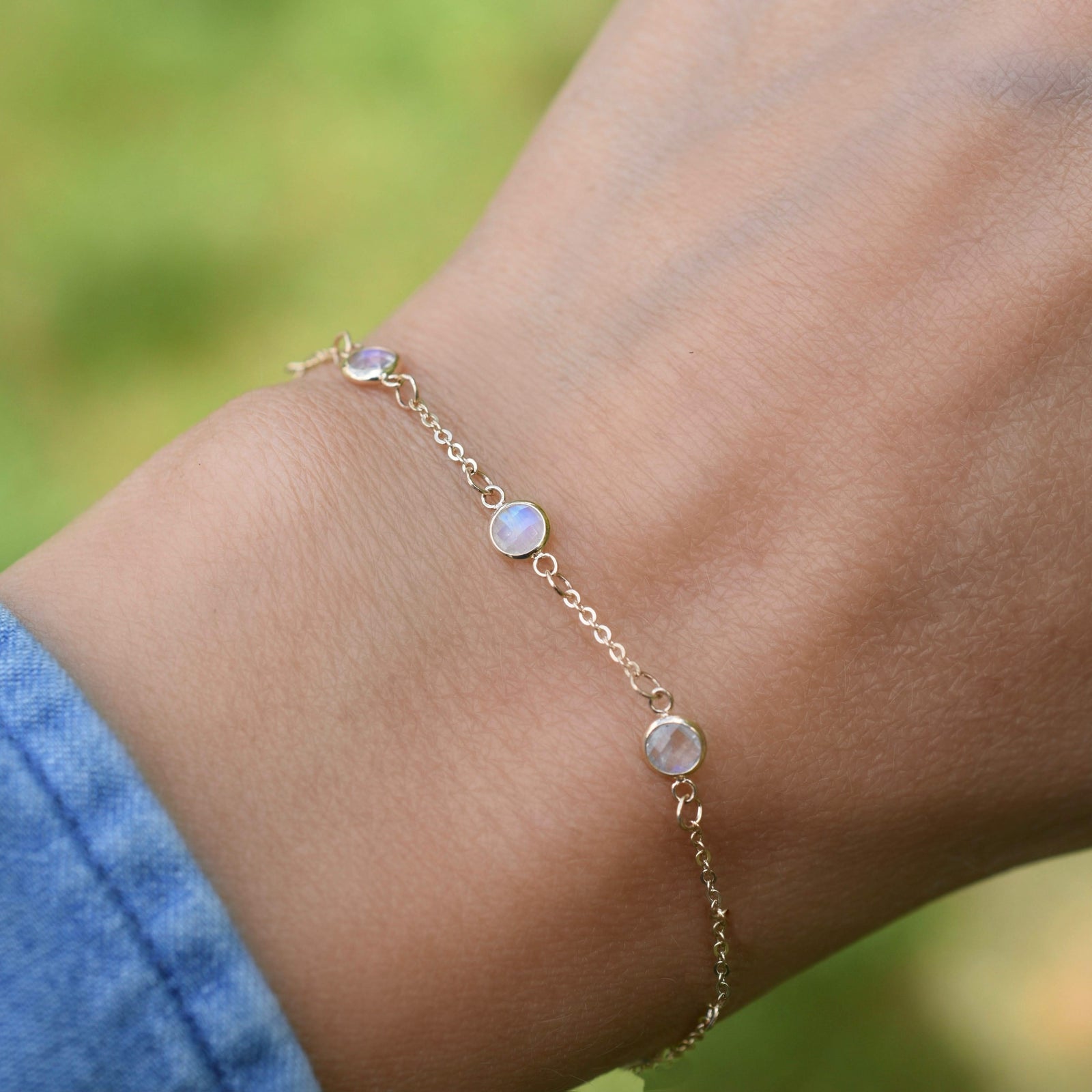 Three bezel set shimmering Moonstones evenly spaced with delicate 14k gold chain make this station bracelet the perfect gift for a June birthday. The round briolette cut stones sparkle in this delightful and elegant design perfect for everyday wear. Layers beautifully with other bracelets.