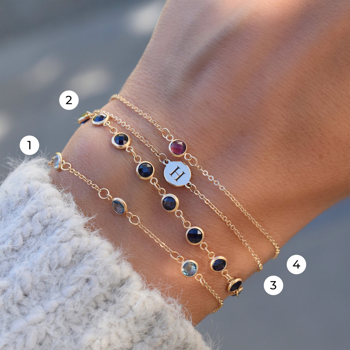 Three bezel set crystalline White Topaz evenly spaced with delicate 14k gold chain make this station bracelet the perfect gift for an April birthday. The round briolette cut stones sparkle in this delightful and elegant design perfect for everyday wear. Layers beautifully with other bracelets.