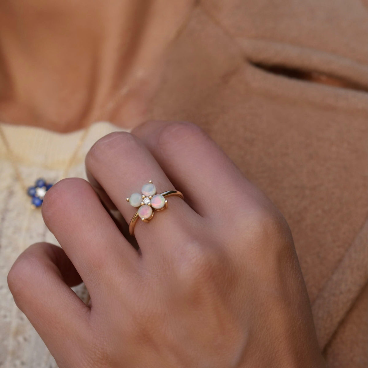 This thoughtfully crafted Greenwich White Topaz and Diamond Petal Ring showcases 5 crystalline White Topaz stones prong set in 14k gold surrounding an accent Diamond. Offering modest luxury, it makes a sparkly April birthday gift. Pair with a Greenwich Flower Birthstone Necklace or Earrings for a memorable anniversary gift.