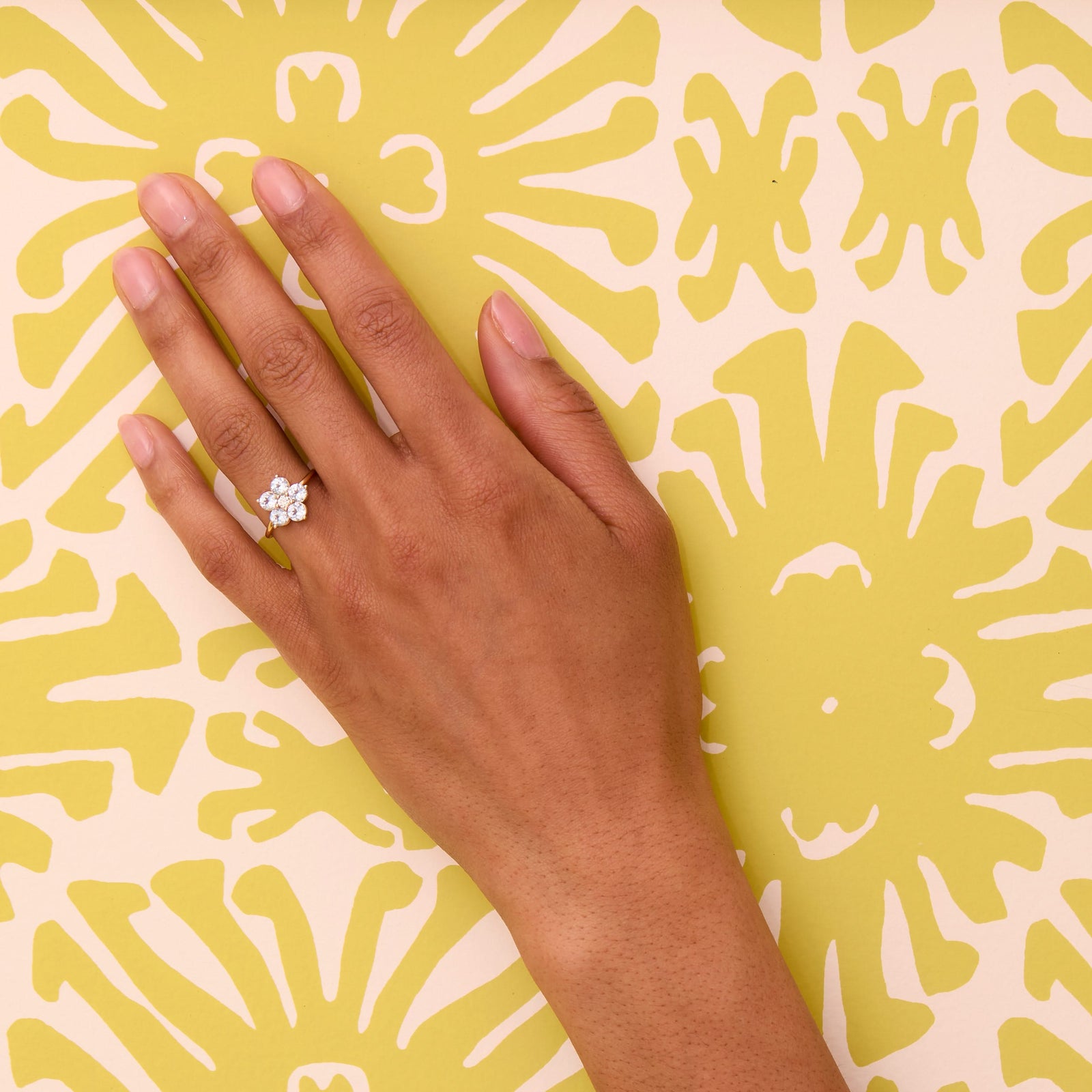 This thoughtfully crafted Greenwich Aquamarine and Diamond Petal Ring showcases 5 serene Aquamarine stones prong set in 14k gold surrounding an accent Diamond. Offering modest luxury, it makes a sparkly March birthday gift. Pair with a Greenwich Flower Birthstone Necklace or Earrings for a memorable anniversary gift.