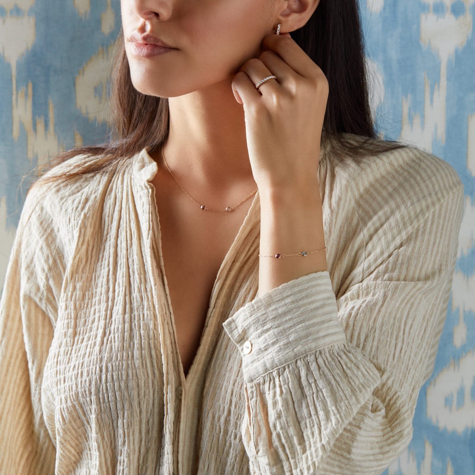 Two sparkly briolette cut birthstones set in 14k gold bezels catch and reflect the light in this balanced bracelet. Dainty chain and genuine gemstones pair femininity and meticulous design. Choose birthstones or select the stone that speaks to you. Perfect for everyday wear - lightweight enough to sleep in and never take off. Layers beautifully with other bracelets. A thoughtful gift for a new mother or grandmother, it is easy to add on birthstones and letters so it can grow with your family.