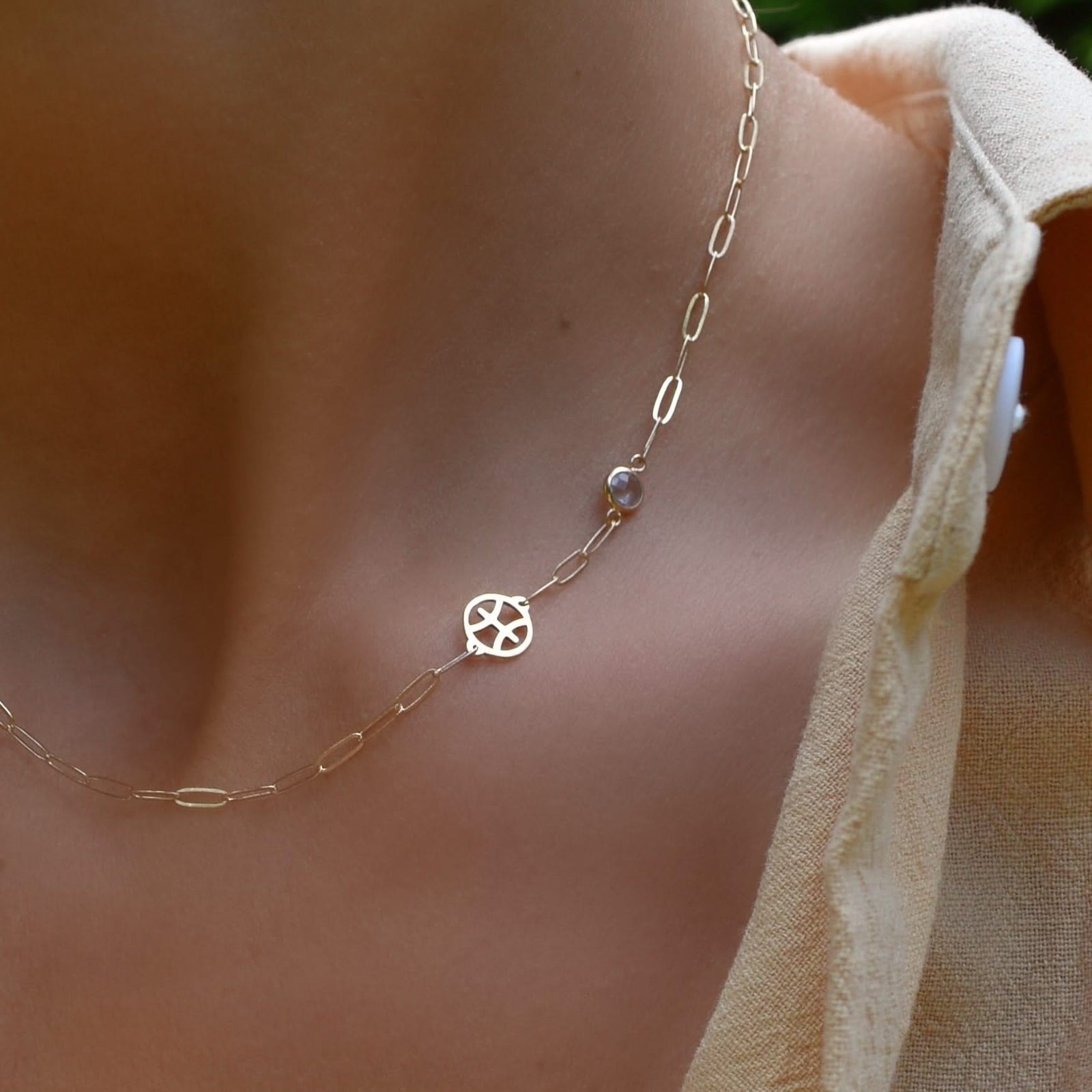 Share your sun sign with the world with this chic, asymmetrical necklace. A cutout Pisces sign, encompassed by a circle, sits next to a sparkly birthstone on a mini paperclip chain. Handcrafted in solid 14k gold, it makes a lovely birthday gift.