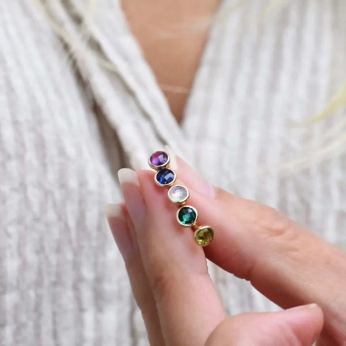 Features 4 mm briolette cut, bezel set, sustainably grown Aquamarines.