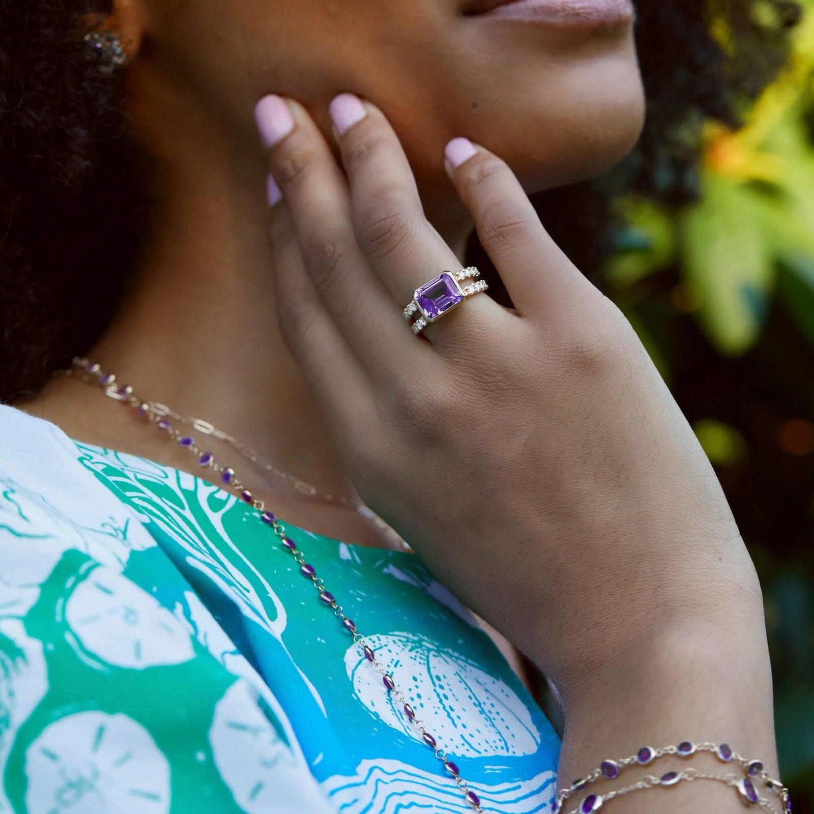A gorgeous emerald-cut amethyst, hand-set horizontally in a 14k-gold bezel, is accented with 16 prong-set diamonds. A statement piece on its own, and perfect for stacking with other rings. The split-shank band offers a substantial yet lightweight setting. Quite flattering on wider fingers. Classic styling makes this a perfect gift for milestone occasions such as February birthdays, graduations, and anniversaries.